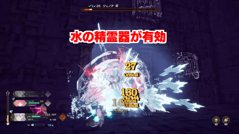 ジェノアは水属性が弱点なので、アイスセイバーを付与した攻撃や、パルミナの水属性魔法で弱点を突いて攻撃しよう。また、ジェノアはその場から動かないため、水の精霊器での攻撃が当てやすく、非常にダメージを出しやすい。精霊器が使用可能になったら積極的に使い、ダメージを稼ごう。