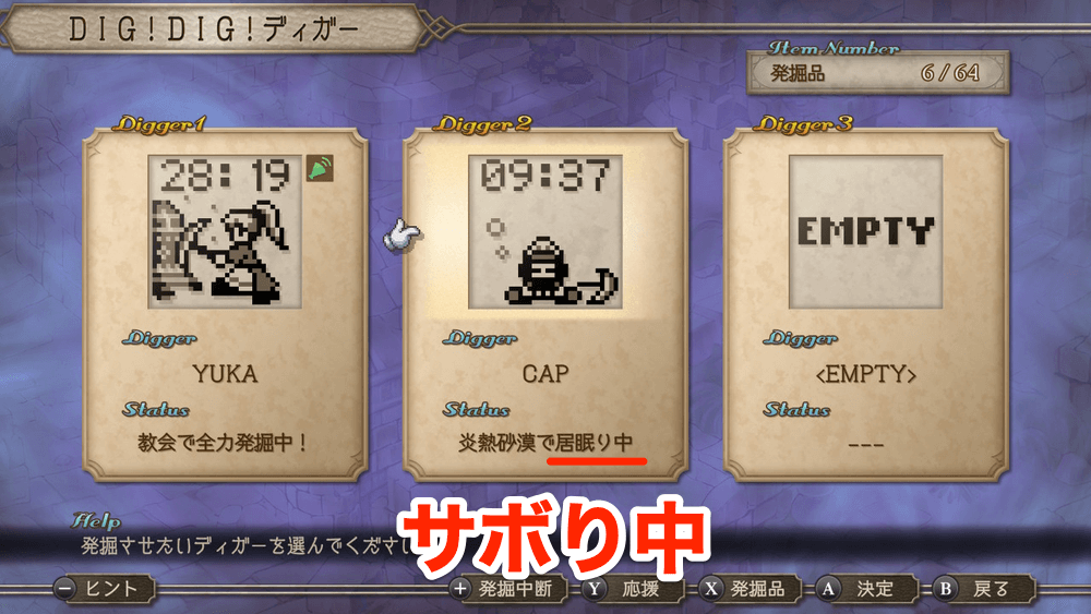 ディガーは発掘中に怠け状態になる可能性がある。ディガーが怠け状態になり放置しておくと発掘が失敗するため、こまめな確認と解除を徹底しよう。