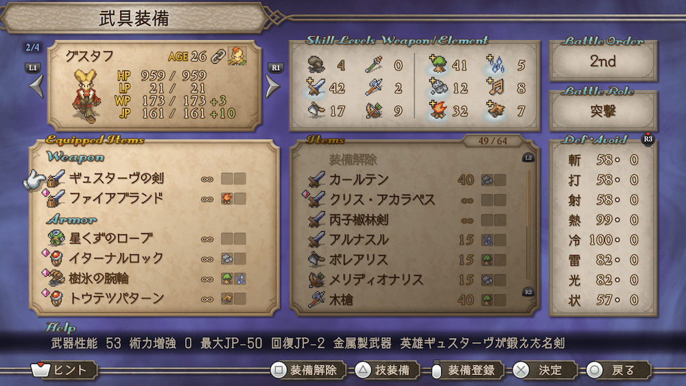 グスタフは武器枠が剣2本で埋まっているため、ギュスターヴの剣でアタッカーを務める他ない。金属武器を外すこともできないため、術による攻撃も避け、剣攻撃絞った運用を心がけよう。