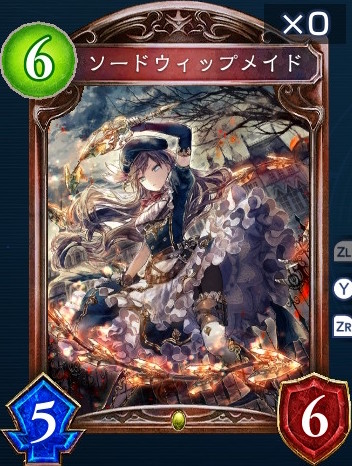 「ソードウィップメイド」は、場に指揮官フォロワーがいれば、ファンファーレで相手フォロワー全てに1ダメージを与える。6コストと場に出るのがバトル中盤からなので、能力が活躍できる場面が少ない。