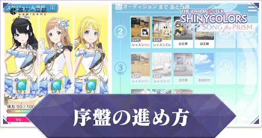 アイドルマスターシャイニーカラーズSONGforPRISM(シャニソン)の初心者向け序盤の効率的な進め方を解説!ゲームの進め方や引き直しガチャ、リセマラはするべきかについても紹介しているため、シャニソンをプレイする際の参考にどうぞ。