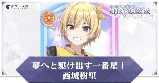 アイドルマスターシャイニーカラーズSONG for PRISM(シャニソン)のPキャラ【夢へと駆け出す一番星!】西城樹里を解説。評価はもちろん、アイドルスキルや潜在アイドルスキル、入手できる衣装や髪型についても掲載しているので、シャニソンをプレイする際の参考にどうぞ。