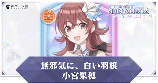 アイドルマスターシャイニーカラーズSONG for PRISM(シャニソン)のPキャラ【無邪気に、白い羽根】小宮果穂を解説。評価はもちろん、アイドルスキルや潜在アイドルスキル、入手できる衣装や髪型についても掲載しているので、シャニソンをプレイする際の参考にどうぞ。