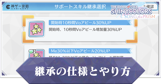 継承ユニットを設定してプロデュースを開始した場合、合宿終了後に継承ユニットからサポートスキルを継承できる。継承できるスキルはランダムで、最大3つ選出される中から好きなスキルを1つ選んで継承しよう。