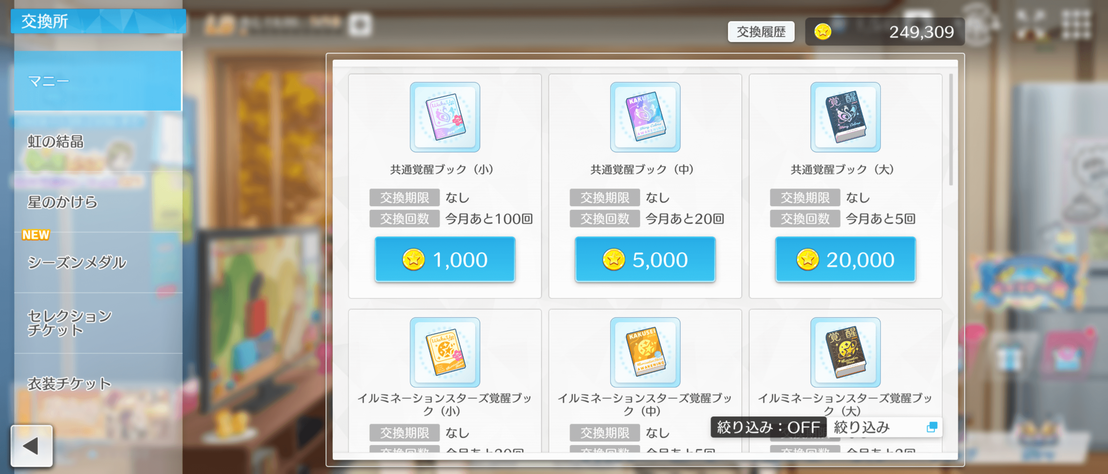 シャニソンの毎月やるべきことでは、交換所で月限定アイテムを交換しておく。シャニソンの交換所「マニー」では、育成用アイテムがマニーと交換可能だが、月の交換数に上限がある。マニーを余らせているときは、育成素材と交換してより効率的に育成できるようになる。