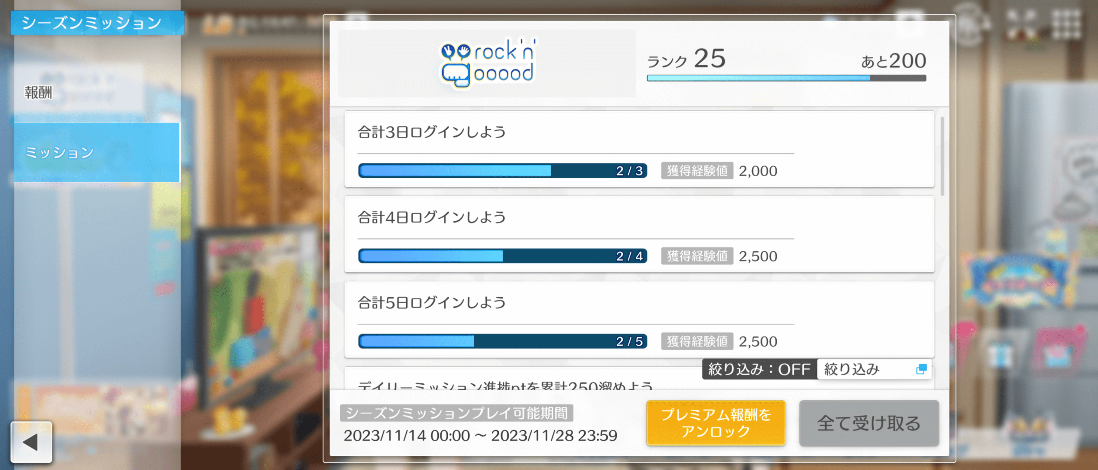 シャニソンをプレイするときは、シーズンミッションのクリアも優先して行おう。シーズンミッションはデイリーとは違い一日限定ではないが、ログイン日数ミッションや期間が2週間と限られている。シーズンミッションを積極的にプレイして、早めに全報酬を手に入れよう。