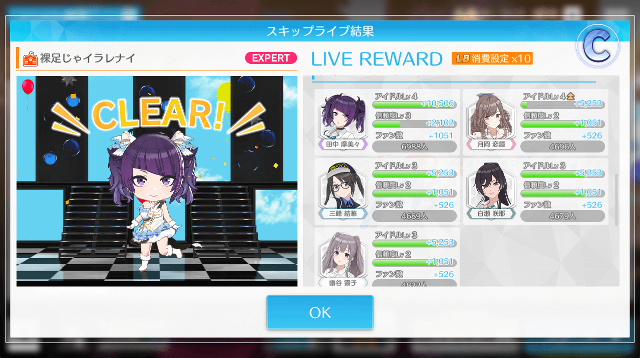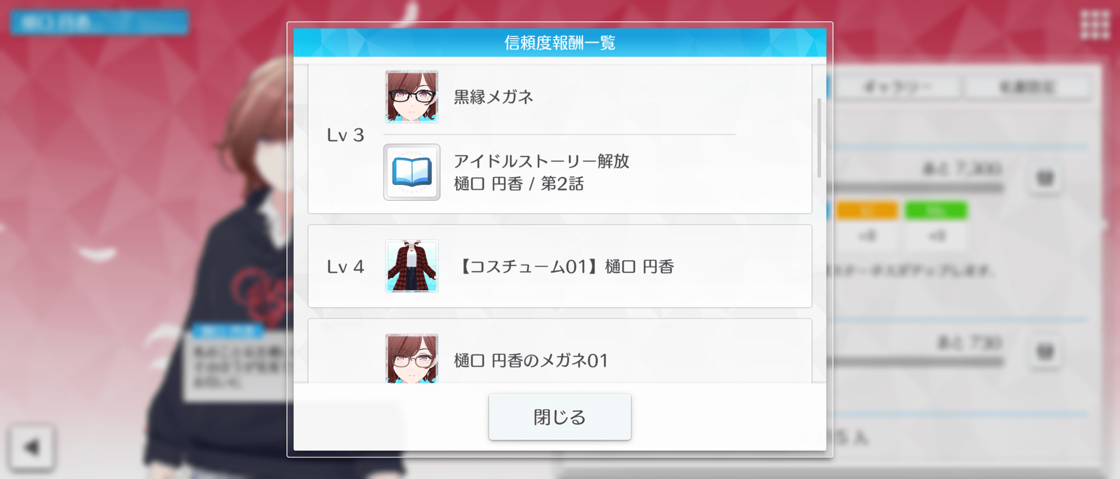 信頼度は、そのアイドルと一緒にライブやプロデュースをすると徐々に上がっていく。信頼度を上げるとメガネ以外にも様々な私服や個別ストーリー、ジュエルも貰えるため、推しのアイドは積極的に信頼度を上げていこう。