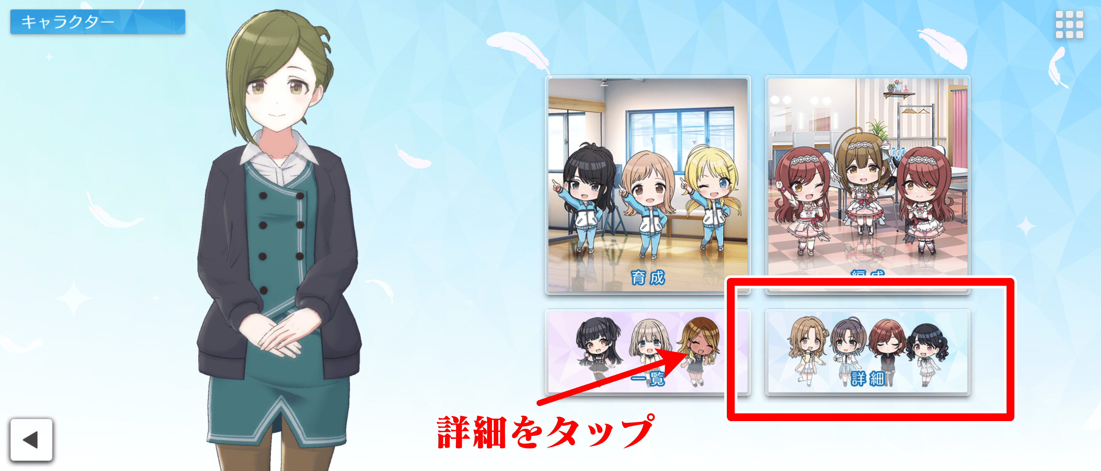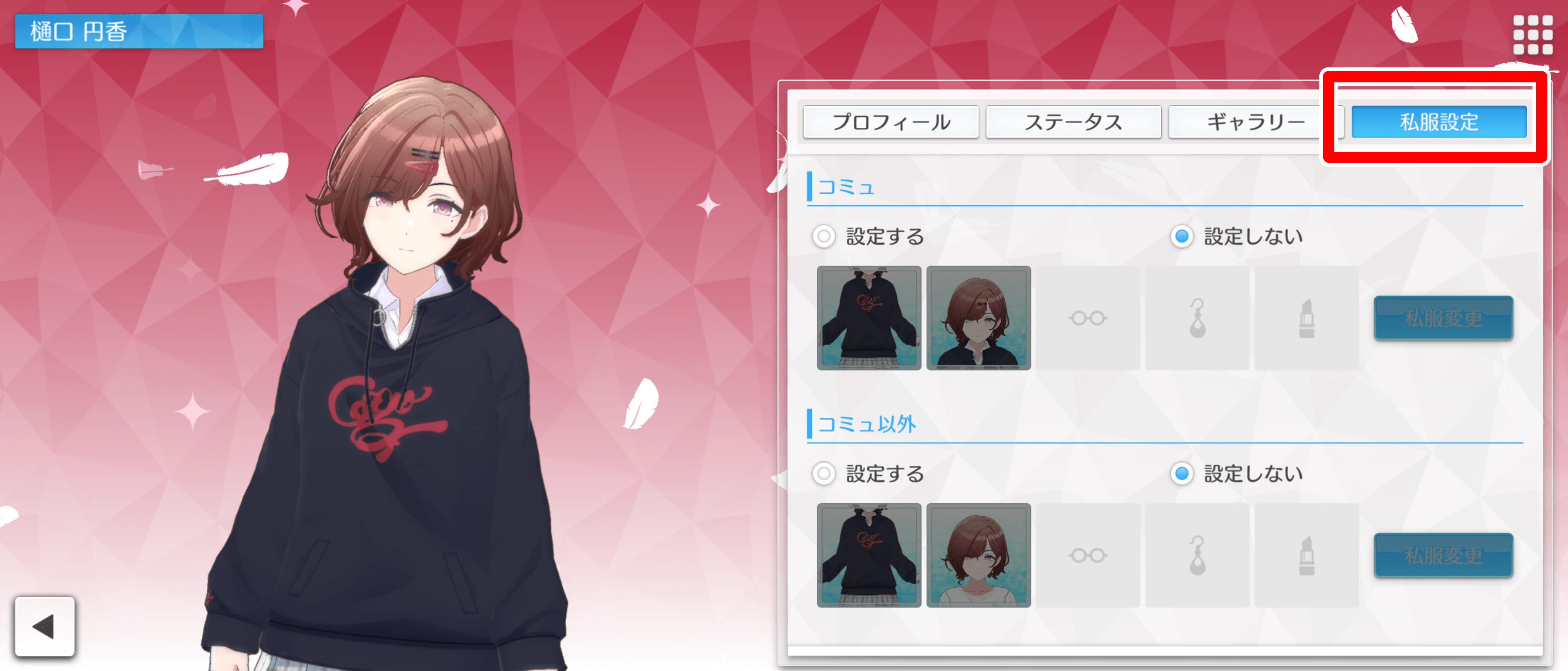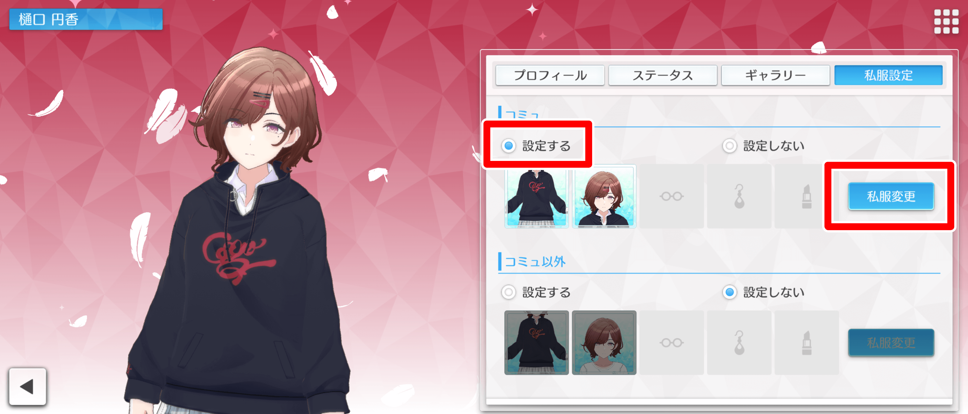 特定のアイドルにメガネを掛けさせたいときは、アイドルの私服を選択して、メガネをかけさせよう。現在はメガネは複数用意されており、好みのメガネ姿を楽しめるようになっている。