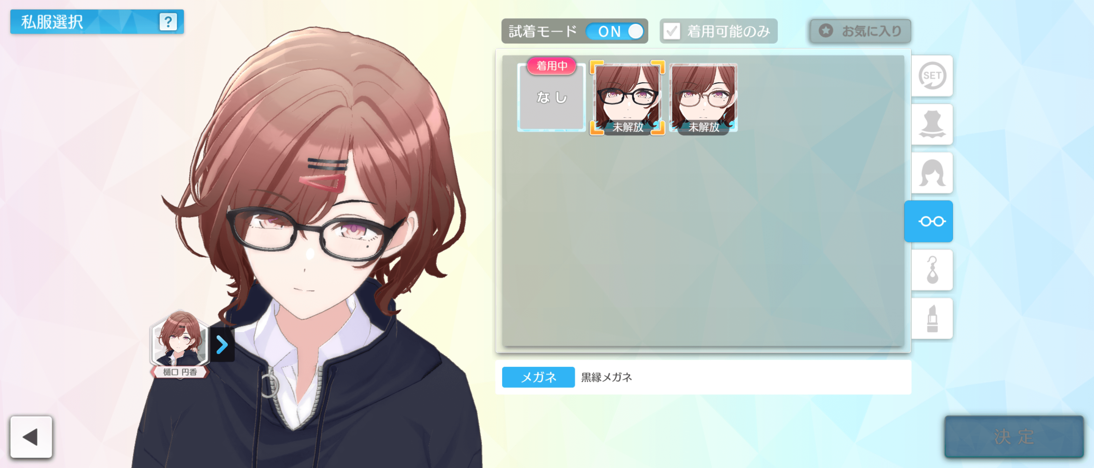 アイドルにメガネを掛けさせたいが、メガネを持っていないときは試着モードを使おう。試着モードでは、入手出来ていない私服を着せられるため、どんな姿になるかお試しで視聴できる。
