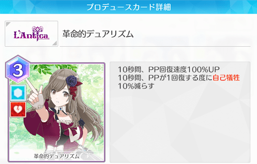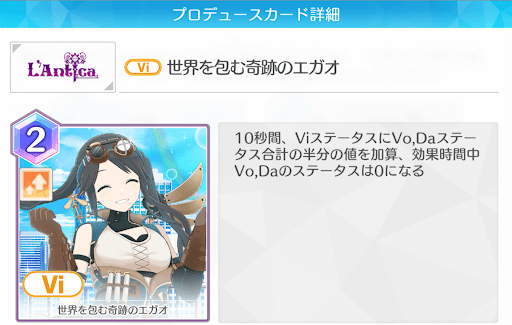 EP2のアンティーカのデッキは、ピンチ状態でないと強くないカードや、過剰な自傷ダメージを受けるカードが多く、メンタルブレイクが頻発する場合も多い。そのため、安定してアピールを稼げるよう、得意属性の汎用アピールカードが出れば採用するのがおすすめだ。