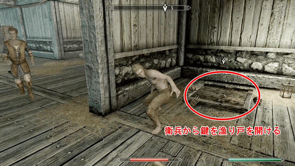 調査書類を読み終えると、マルボーンが2人の衛兵に連行されてくるので、衛兵を倒して救出しよう。倒した衛兵のアイテムを漁ると、脱出口を開けるための「落とし戸の鍵」が入手できる。