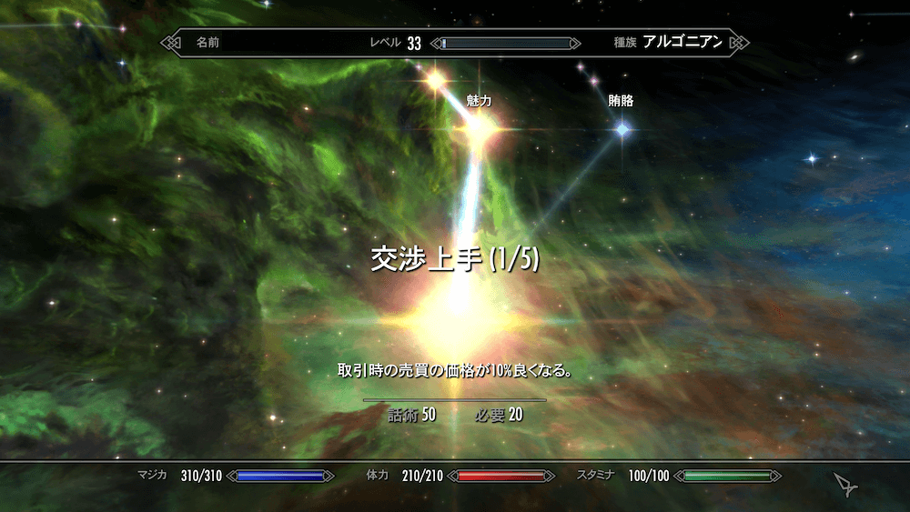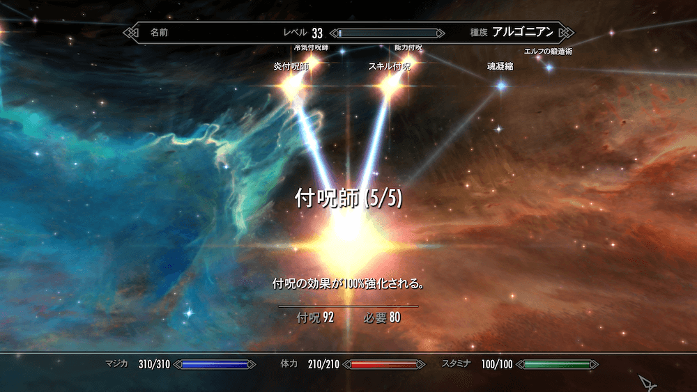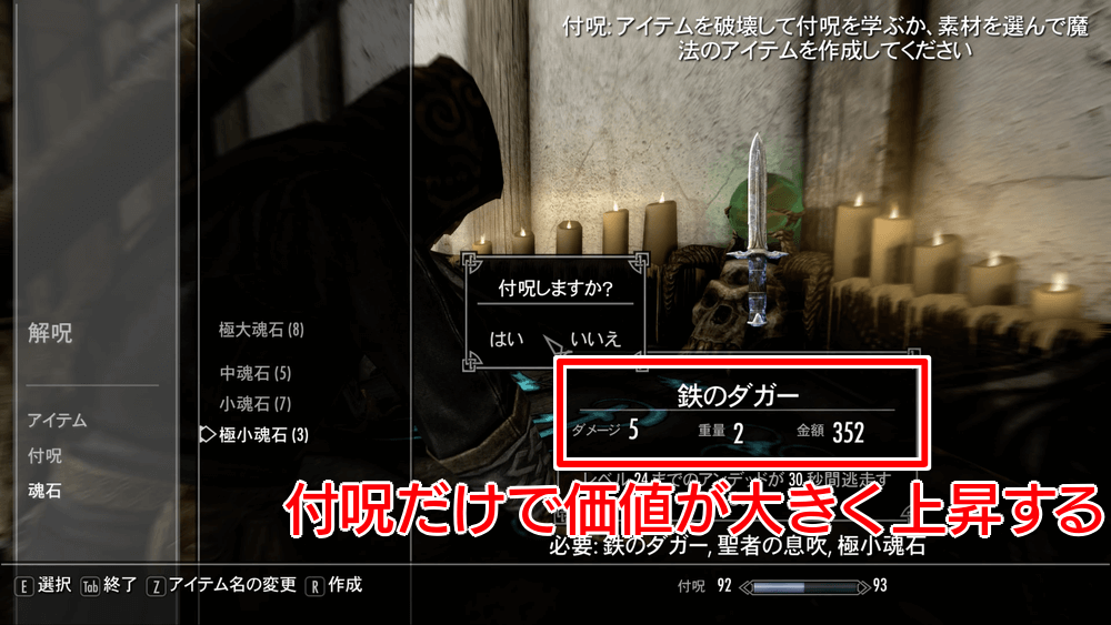 薬同様に、付呪装備も性能が高いほど売却額が伸びるため、スキルが上がったらパークを取得して性能と売却額を伸ばそう。付呪は最終的にほぼ全てのパークを取得し、最強装備作成にも使うため、途中で取ったパークは無駄にならない。