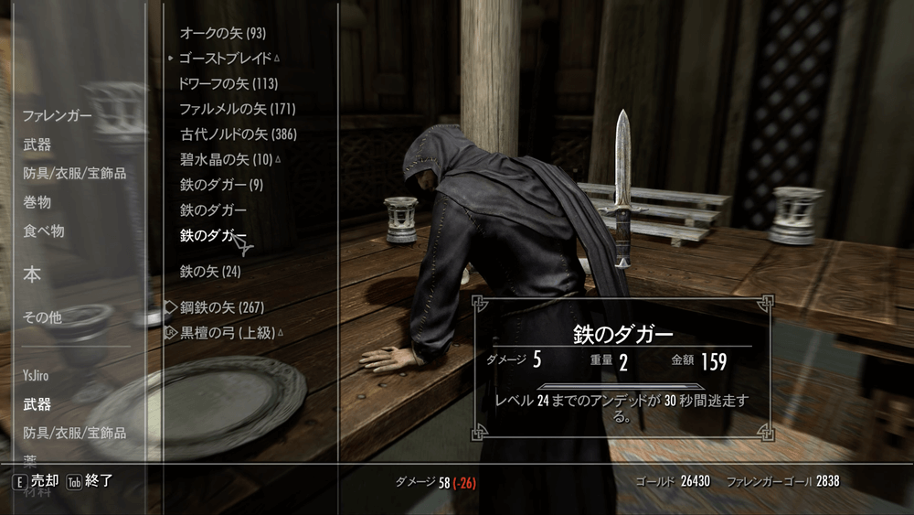 元手となる資金が揃ってきたら、本格的に付呪装備を売却してお金を稼いでいこう。集中して稼ぐなら鉄のインゴットと革ひもを使って「鉄のダガー」を作成し、作ったものに聖者の息吹を付呪して売却、その後時間を1日分経過させて品揃えと所持ゴールドをリセットして稼ぎを繰り返すと良い。