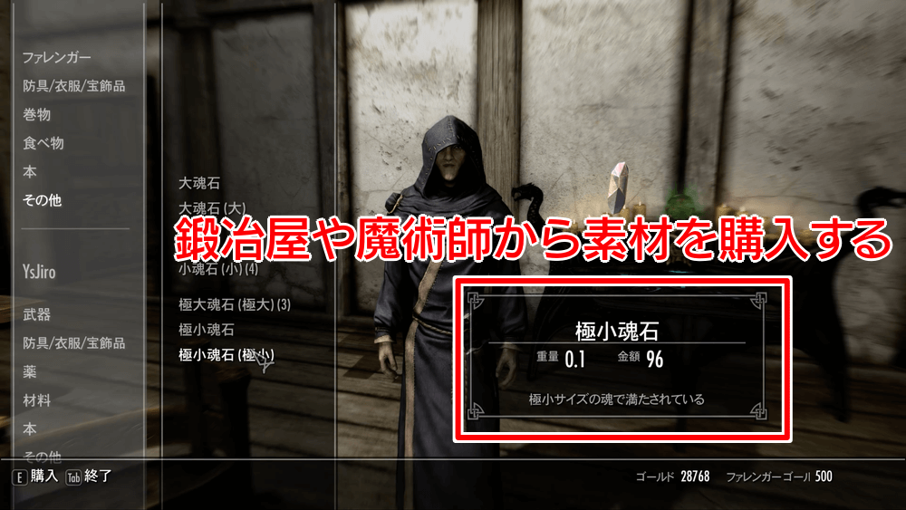 錬金術での稼ぎが軌道に乗り、1000ゴールド程余裕ができたら、ホワイトランの入口付近にある装備屋で「鉄のインゴット(鉄の鉱石)」と「革ひも」を、ドラゴンズリーチの魔術師から「最小魂石(最小)」を購入しよう。どちらもより金策効率が高い「付呪装備の作成」に使うほか、最強装備を作るための「鍛冶」と「付呪」のスキル上げに使える。