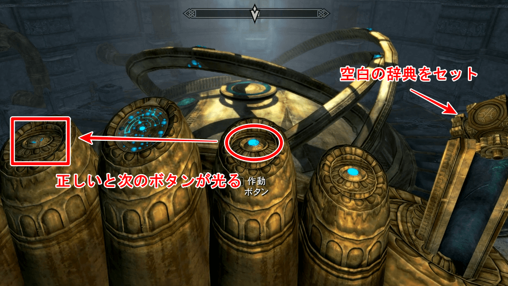 機械の前で「空白の辞典」をセットし、ボタンを順番に押して装置を起動させよう。ボタンは右側から順番に、次のボタンが使えるようになるまで押し続けるだけでOKだ。