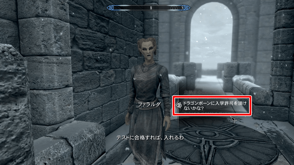 大学内に入るために、入口の前にいるファラルダにシャウトを見せよう。ファラルダに話しかけて「ドラゴンボーンに入学許可を頂けないかな?」を選択し、ファラルダの前でシャウトを使うと、大学に入れるようになる。