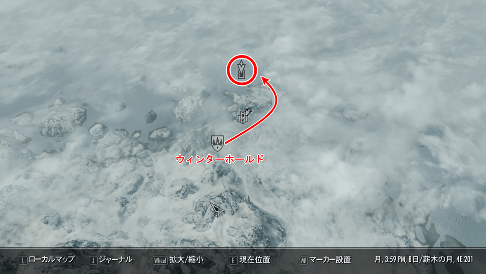 マップ 外観 セプティマスがいるウィンターホールド北の氷原へむかい、隠れ家でセプティマスと会おう。星霜の書について聞くと、「空白の辞典」と「アチューンメント・スフィア」を貰い、次の目的地がマップに表示される。