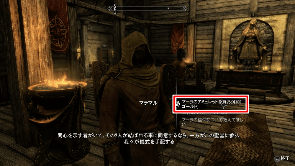 聖堂に着いたら、中にいるマラマルから話を聞き、「マーラのアミュレット」を200ゴールドで購入する。好感度の高いNPCがいない場合は購入する選択肢自体が出ないため、選択肢が出なかった場合は好感度上げに向かおう。