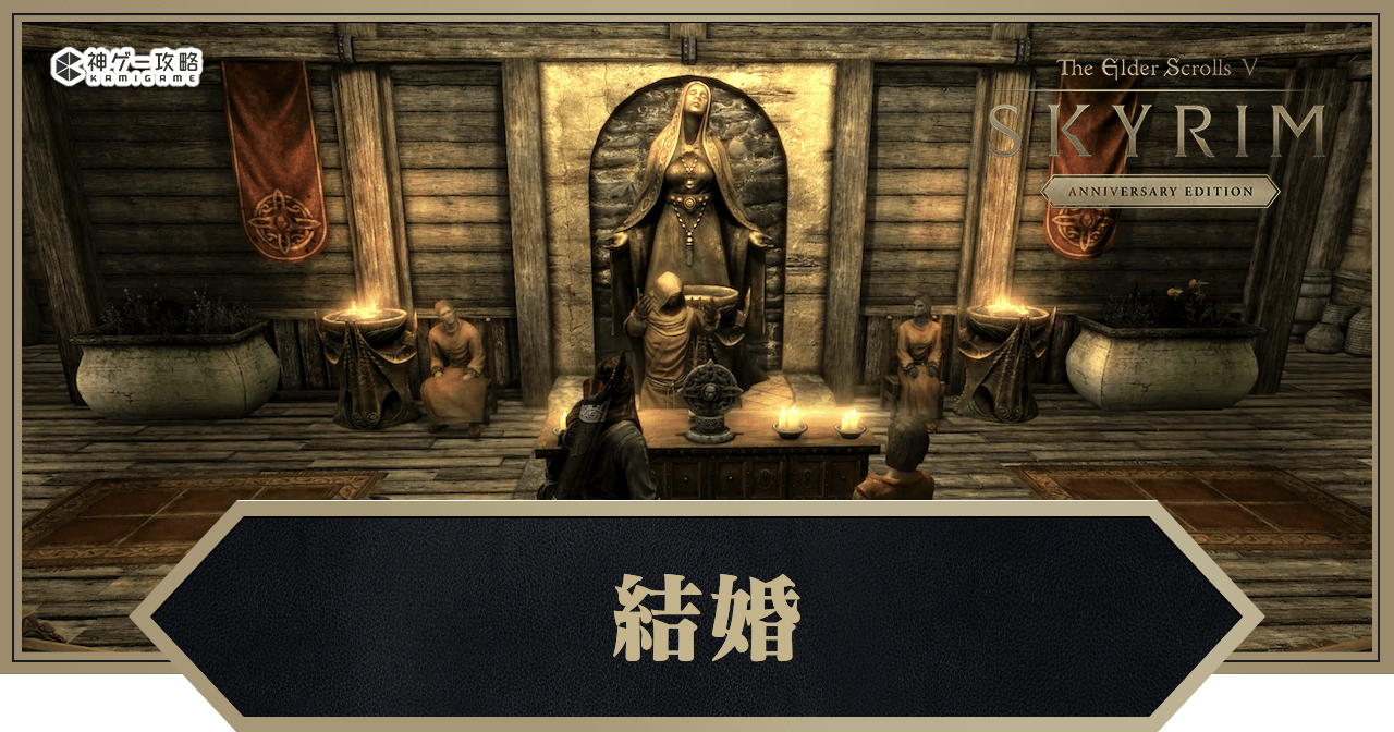 スカイリム(Skyrim)の「結婚」を解説。結婚のやり方や必要装備、メリットに加え、注意点についても掲載しています。