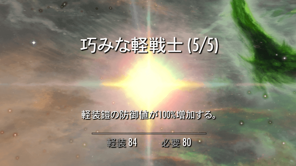 巧みな軽戦士は、軽装鎧の防御力が上昇するパークだ。レベル20ごとに上位効果が解放されていき、最大で防御力を2倍まで上昇させられる。ただしスカイリムにおける防御力の上限は567であり、この数値は鍛冶強化でも達成可能なため、鍛冶で567以上の装備を作れるなら取る必要はない。