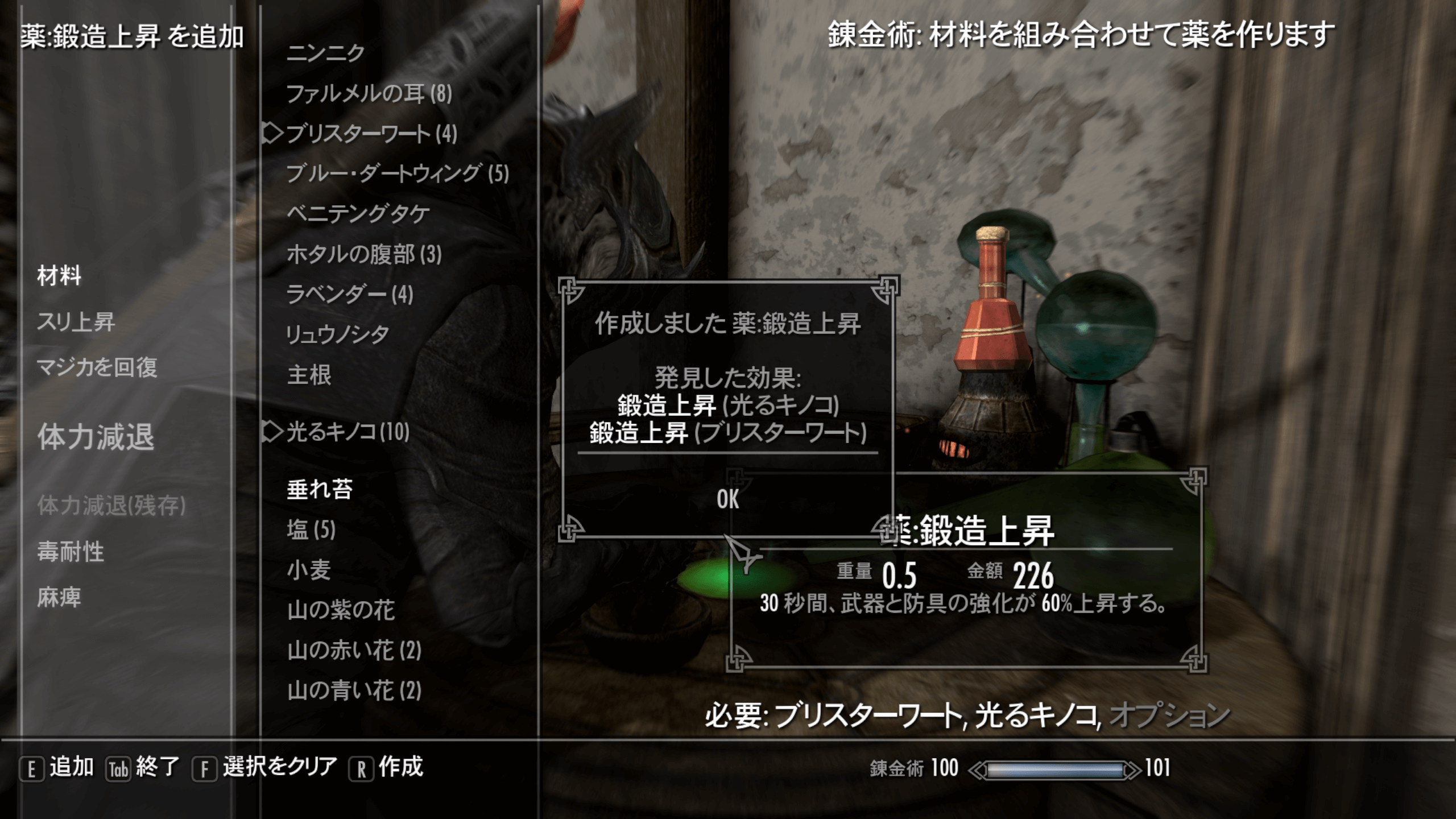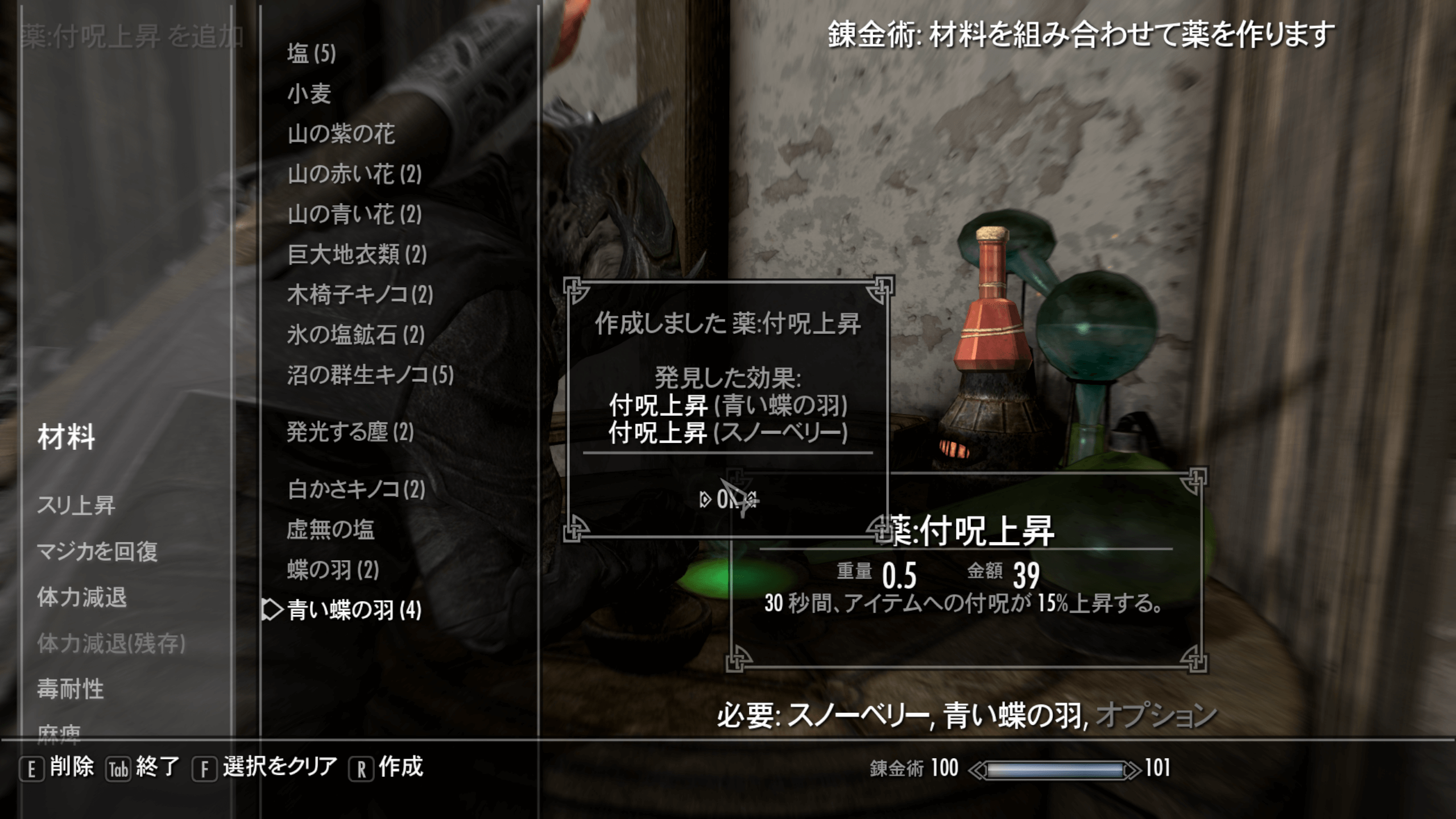 • 4錬金装備に着替え付呪上昇の薬を4個作る