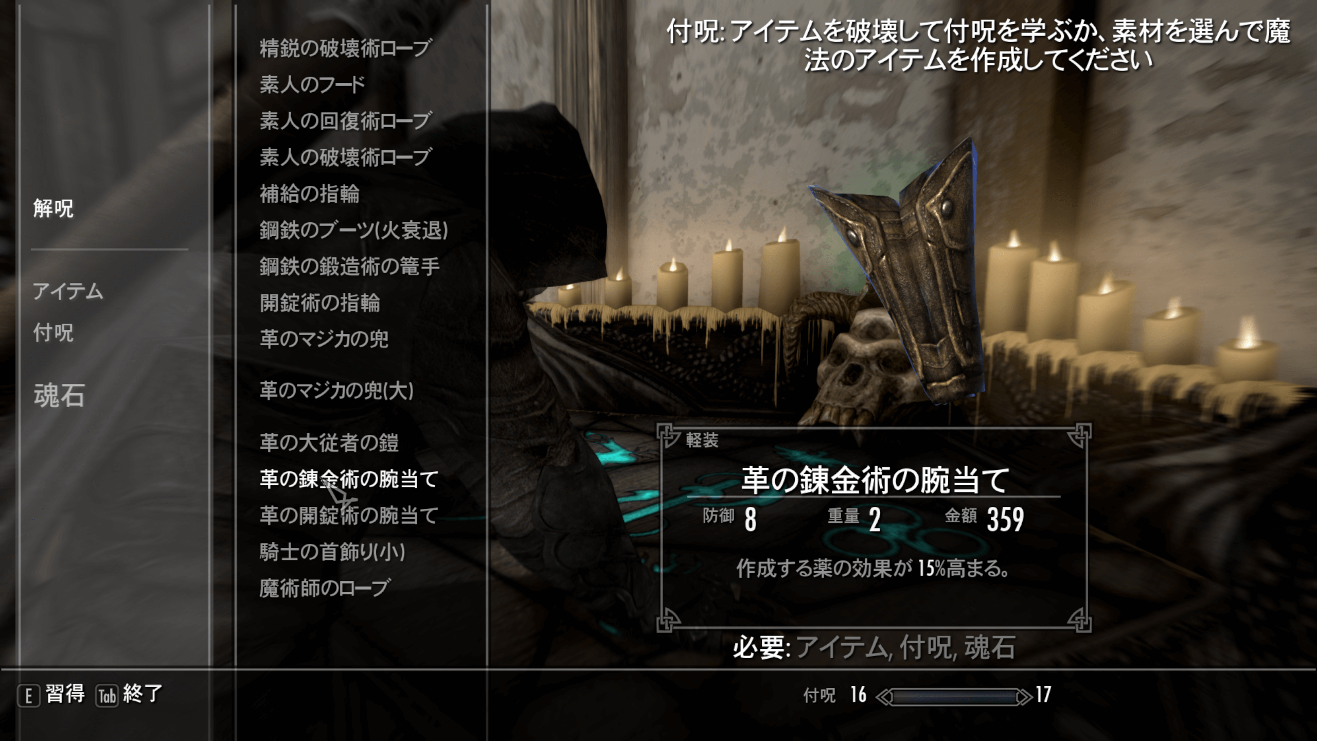 錬金術スキルを最大まで強化したら、次は付呪スキルを100まで上げよう。錬金上昇や鍛造上昇の効果を持つ、強力な作業着を作成するために必要だ。付呪を行うための魂石は、ウィンターホールド大学やリフテンで多く販売されるため、魂石を250個近く買って付呪を行おう。