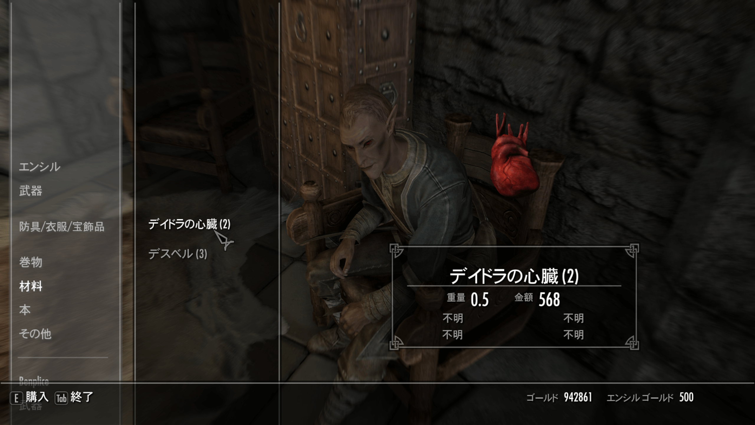 デイドラの心臓は、ウィンターホールド大学の達成の間にいる、エンシルから確定で購入可能だ。ただし、エンシルが部屋にいないときに話しかけても、デイドラの心臓は購入できないので注意しよう