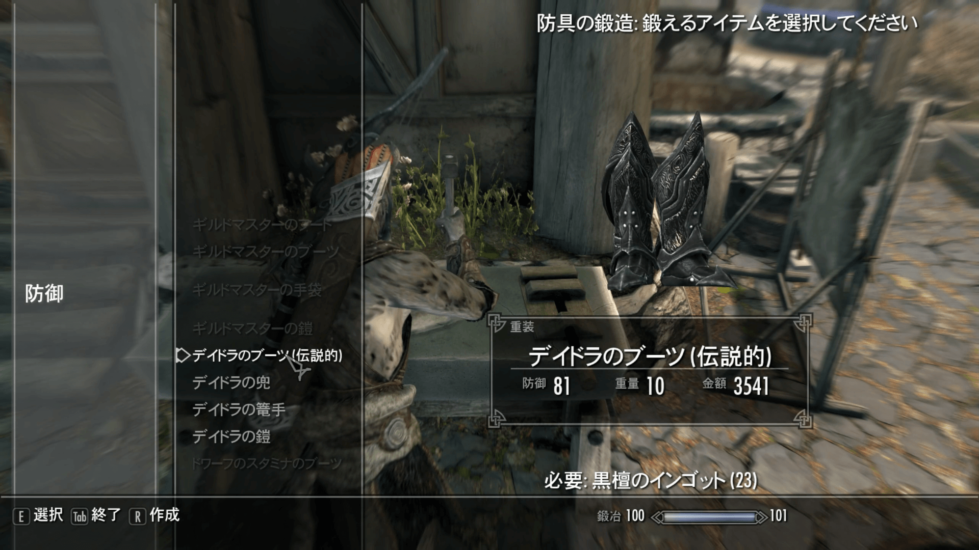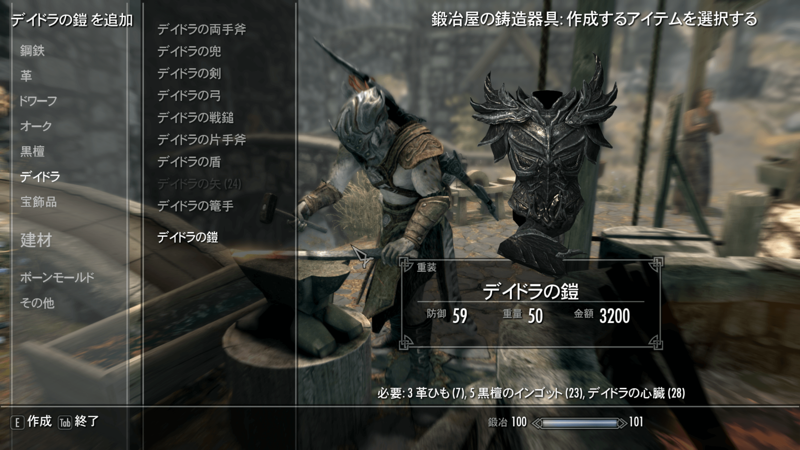 作業着と薬を作ったら、鍛造器具で任意の装備を作ろう。軽装の最強防具を作りたいならドラゴン、重装の最強防具を作りたいならデイドラを作ると良い。
