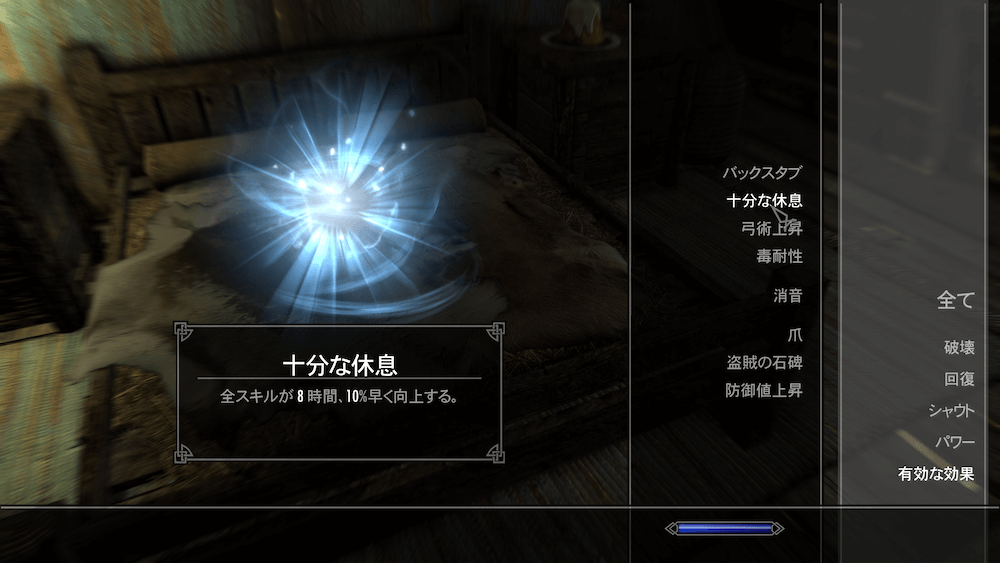 家にあるベッドは自身が所有しているベッド扱いになり、寝ると8時間の間、10%のスキル上昇ボーナスが得られる。宿屋等で寝た場合よりも多くのボーナスが得られるため、スキル上げの観点からも、早めに家を購入するのがおすすめだ。
