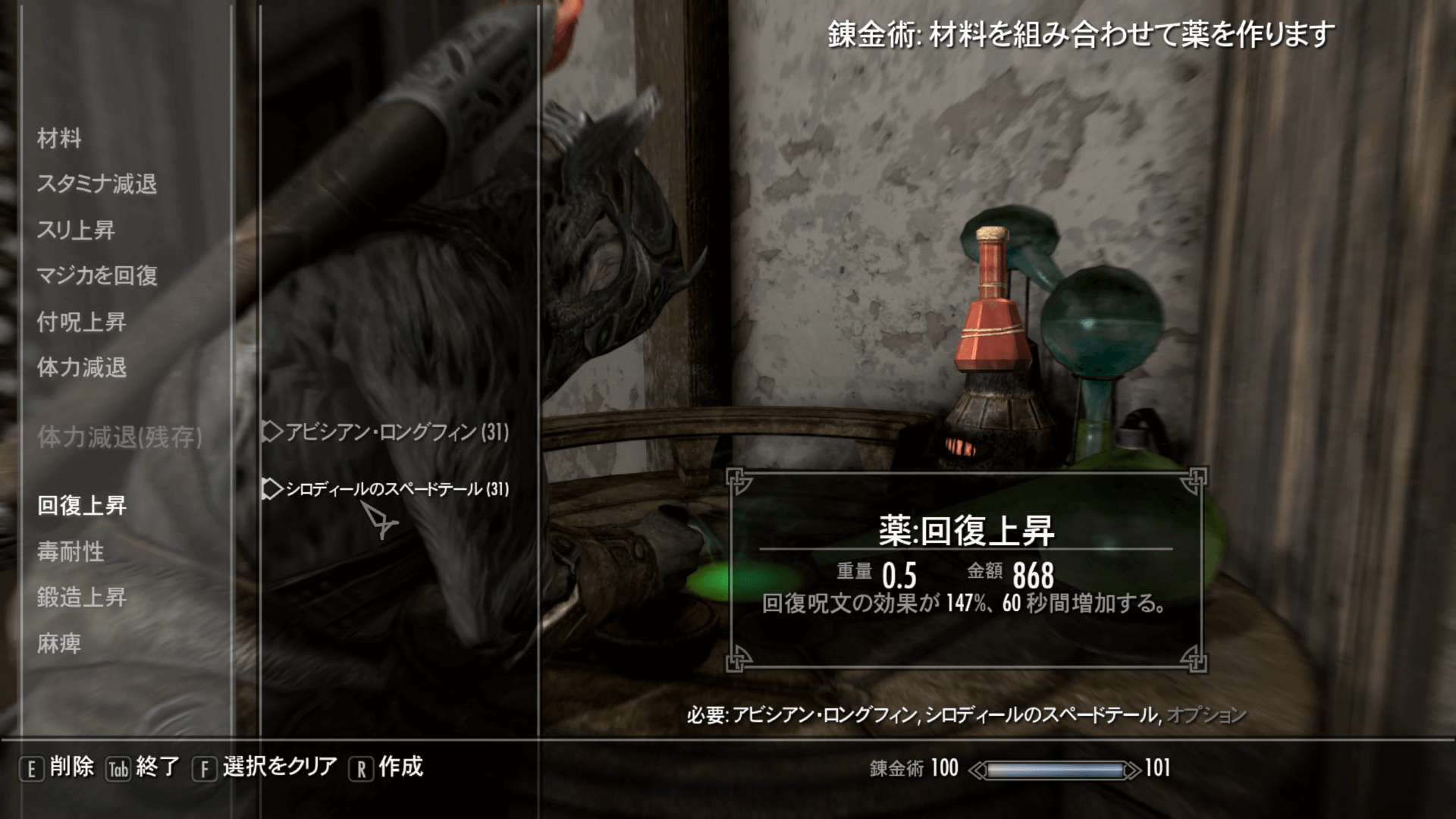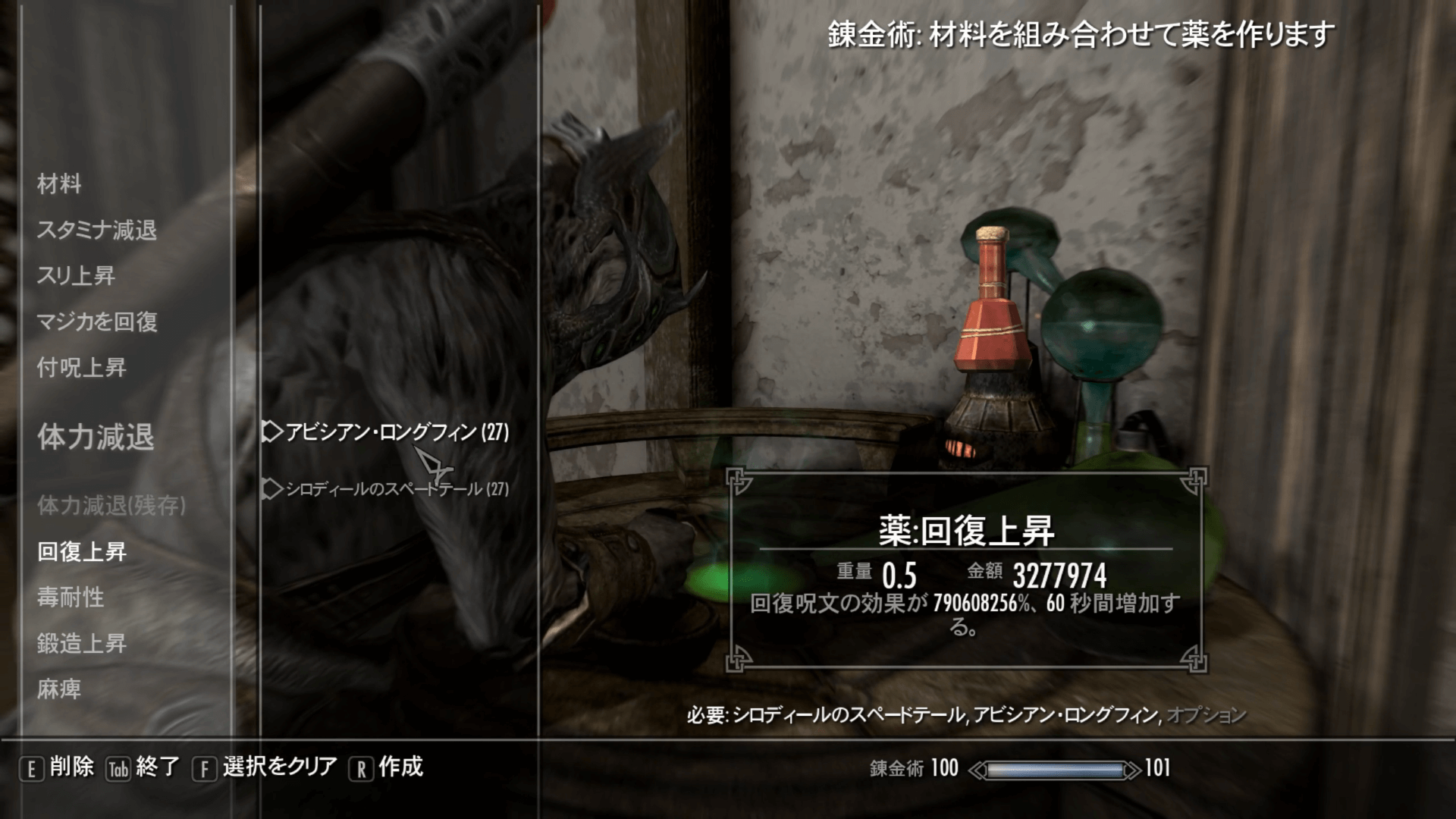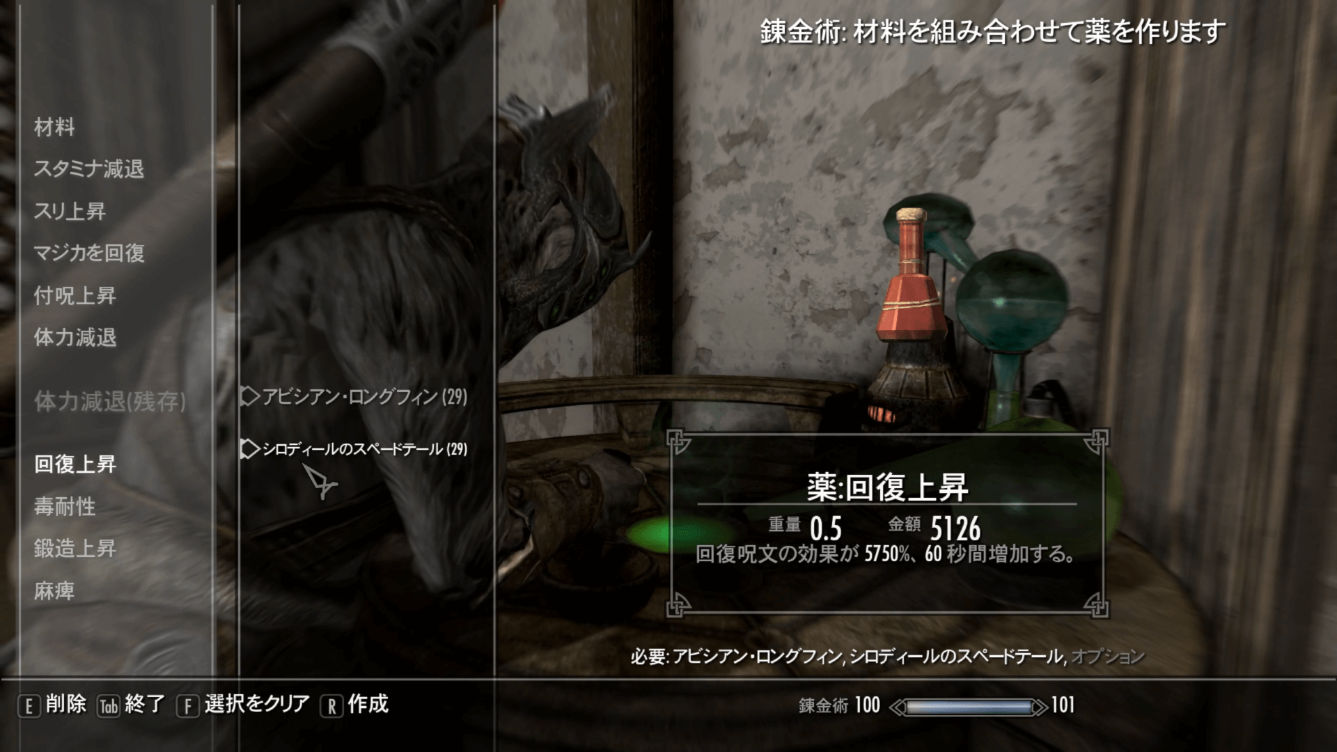 回復上昇の薬の素材 アビシアン・ロングフィン シロディールのスペードテール 塩 小さな枝角 装備とバークを揃えたら、回復上昇の薬を作成しよう。この時点ではまだバグは発生しないため、普通の回復上昇の薬を作るだけでいい。