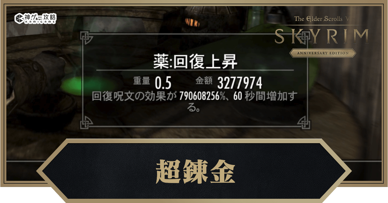 | 超錬金はスカイリムのバグを利用しており、通常では作れない強力なアイテムを作成できます。ゲームバランスを完全に崩壊させるため、利用する際は自己責任でお願いします。 |