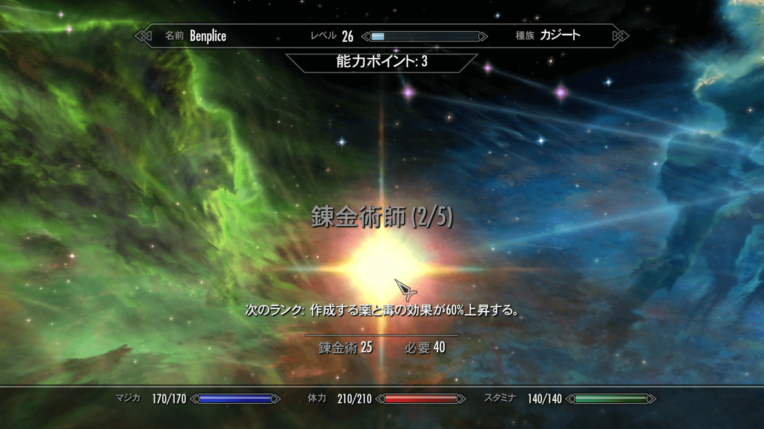 超錬金ができないときは、錬金術の錬金術師パークをレベル2以上取得しよう。錬金術師パークが低いと、上昇値の問題か超錬金が発生しない。