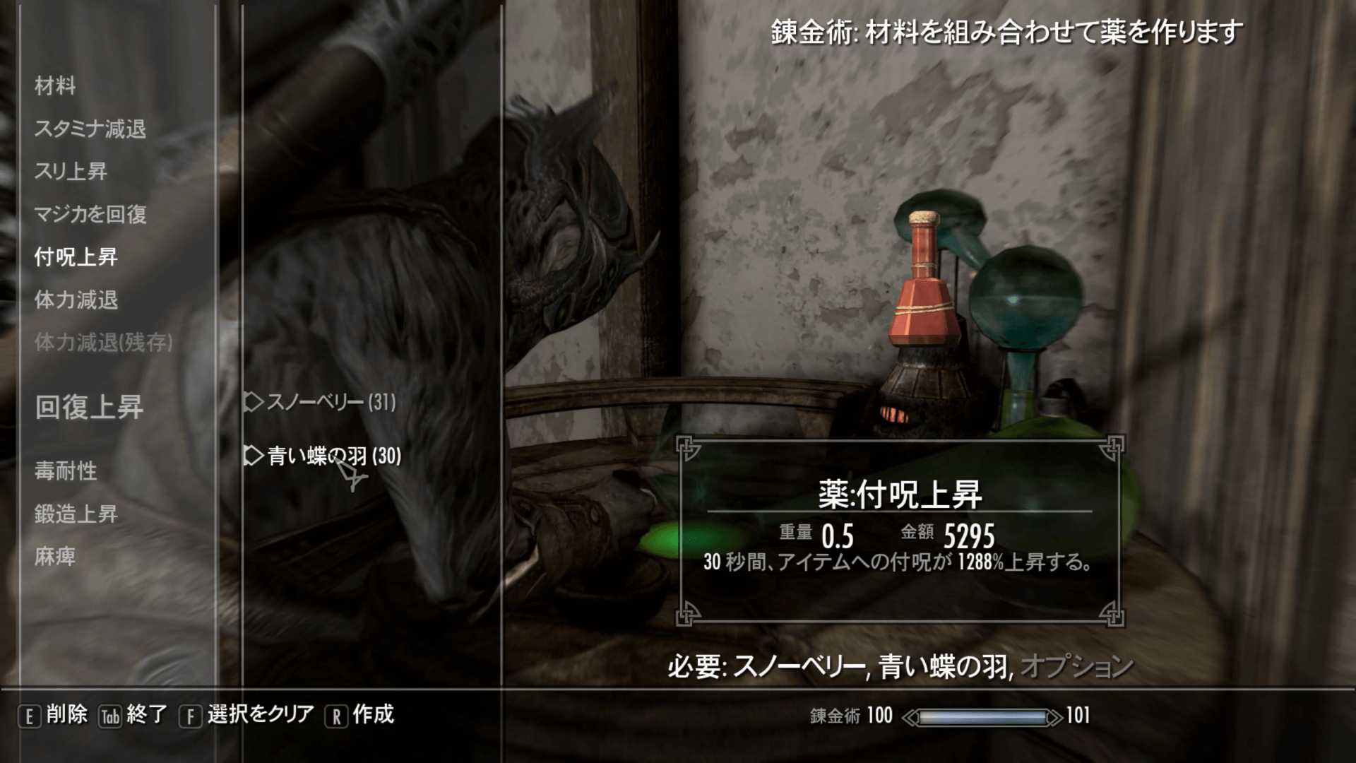 回復上昇の薬の効果を十分に上げたら、別の薬を作成しよう。回復上昇の薬の上昇量は別の薬にも反映されるため、付呪上昇や鍛造上昇の薬でも異常な数値のものが作成可能だ。これらの薬を使えば、通常プレイでは決して作れない数値の装備が作成できる。