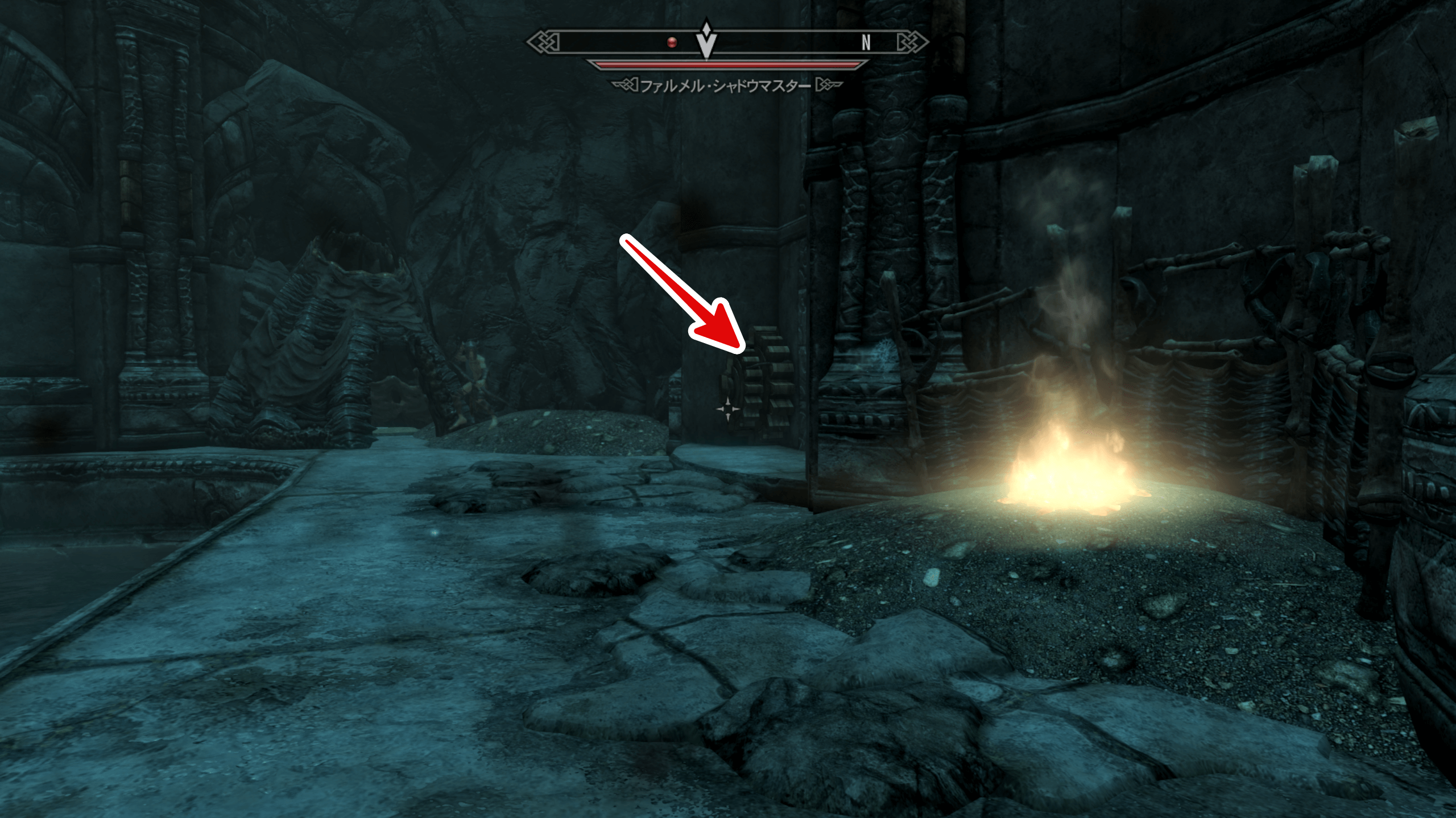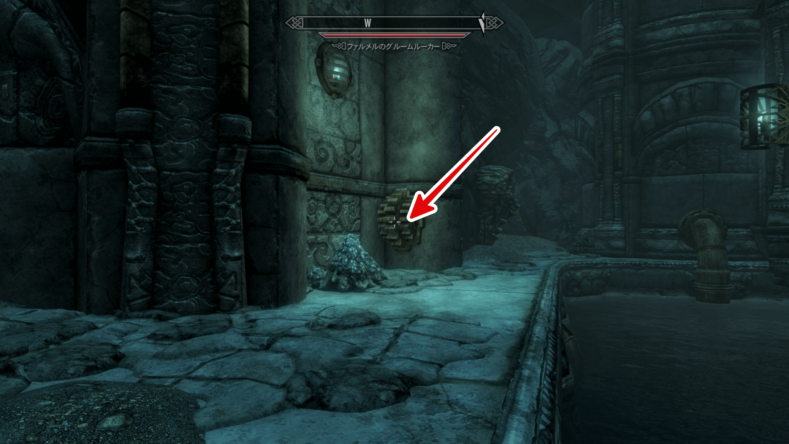 ラルドサールから更に地下に進み、ファルメルの居住地を通り抜けよう。居住地から更に奥に進むには、テント横にあるボタンを押して、奥まで道を繋げる必要がある。