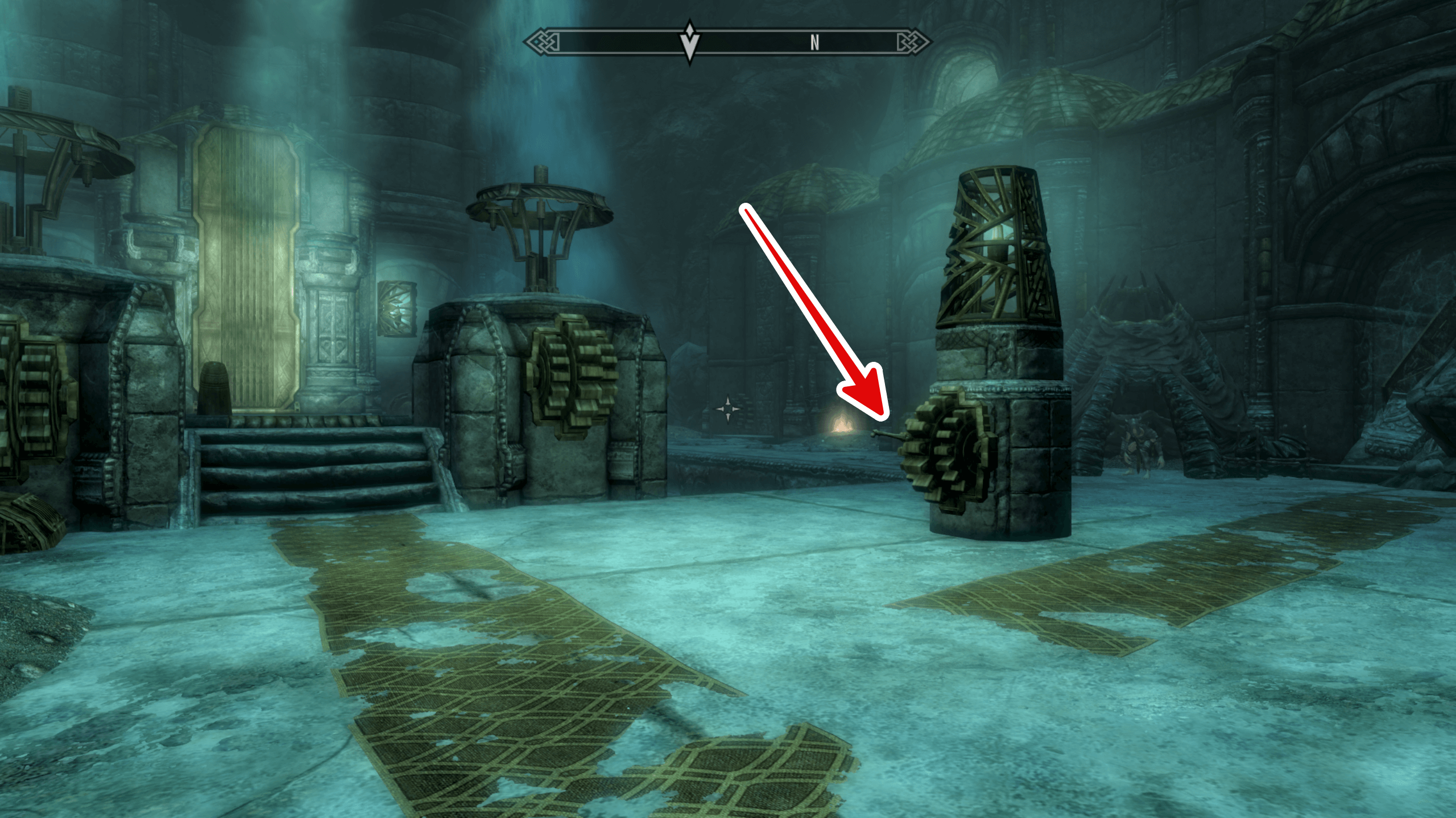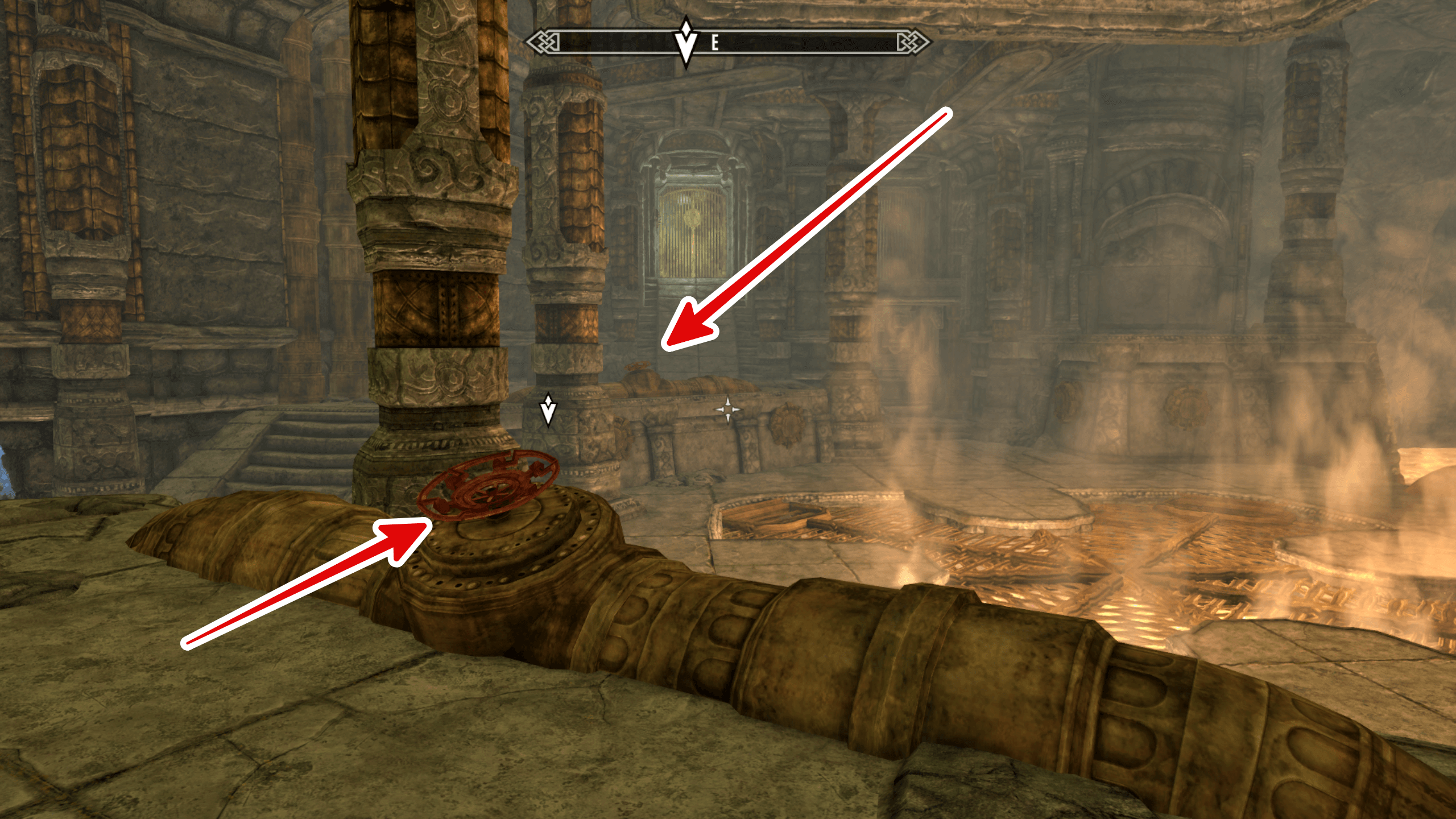 共鳴器具のギミックの奥に進むと、蒸気が立ち昇る広間に出る。左右にある2つのバルブを動かし、蒸気を止めよう。