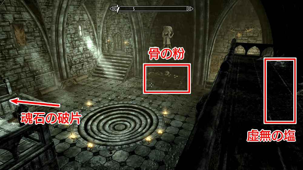 | 11 | 部屋内で儀式に使う素材を集める・上階北の棚で「浄化された虚無の塩」入手 ・部屋西の作業台で「丁寧にひいた骨の粉」入手 ・部屋南の棚で「魂石の破片」入手 |