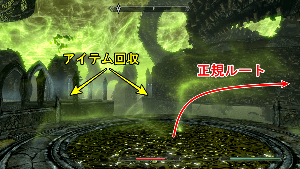 動くトンネルを通って、右の足場に乗り移ろう。周囲には黒い海が広がっており、落ちると一瞬でHPを削られるので、足を踏み外さないよう慎重に進むのがおすすめだ。