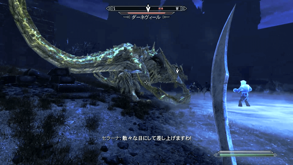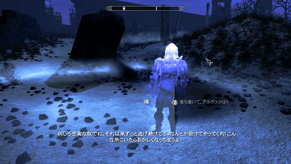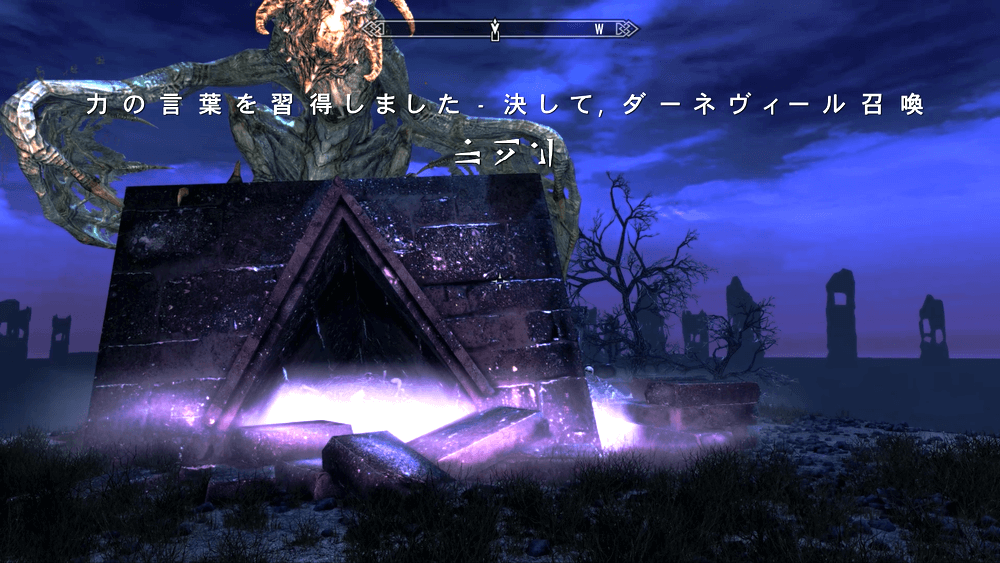 ボーンヤードから外に出ると、イベントでシャウト「ダーネヴィール召喚」の3文字を習得する。習得後に現世で一度使用し、サブクエストを終わらせておこう。