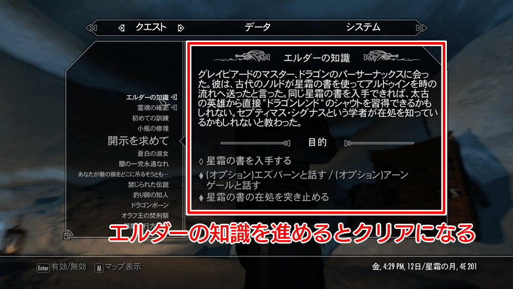 クリアが必要なメインクエスト一覧 解放 嵐の前 ブリークフォール墓地 ドラゴンの目覚め 声の道 創始者の角笛 闇に眠る刀剣 外交特権 追い詰められたネズミ アルドゥインの壁 世界のノド エルダーの知識 星霜の書(竜)はメインクエストの中で入手できるアイテムであり、「巻物の偵察」が発生した場合は未クリアの可能性が高い。上記の12クエストのどれかがクエスト欄に残っているか確認し、クエストを進めていこう。