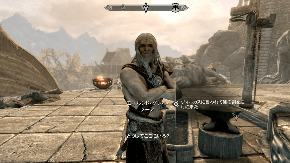 試験後、ヴィルカスの剣をエオルンドに届けよう。エオルンドは、ジョルバスクルの裏口から、坂を登った先の鍛冶場にいる。