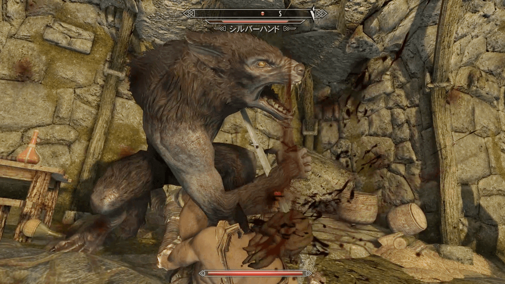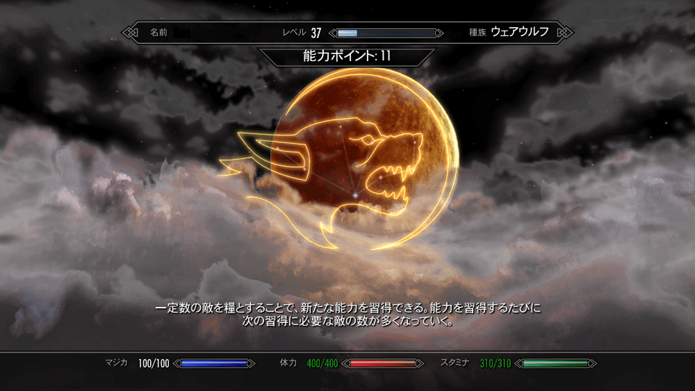 DLC第1弾であるDawnguardを導入すると、ウェアウルフ専用のスキルパークが追加される。ウェアウルフは、NPCの死体を一定数食べると能力ポイントを取得でき、パークで変身中の追加能力やステータス強化が可能だ。