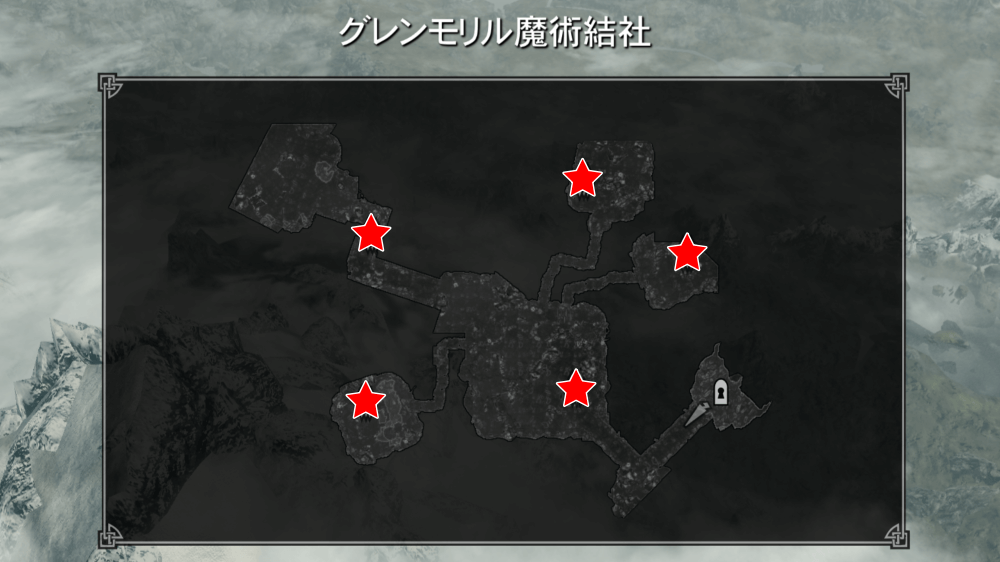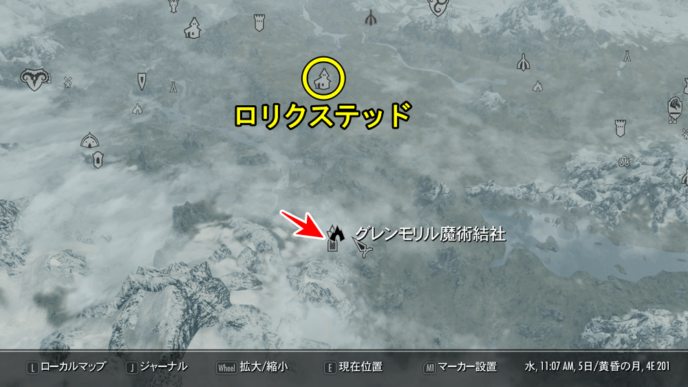 コドラクの依頼を聞き入れたら、スカイリム南西にあるグレンモリル魔術結社へ向かおう。ロリクステッドまで馬車やファストトラベルで移動し、そこから徒歩で南下していくと良い。