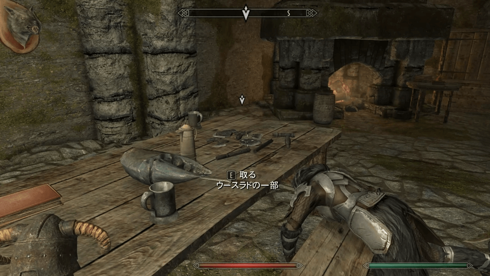 奥の部屋でシルバーハンドを倒し、テーブルの上にあるウースラドの一部を回収しよう。また、同じテーブルの上には、片手武器のスキルブック「2920 暁星の月1巻」がある。さらに、暖炉の前には防御のスキルブック「戦士」があるので、両方拾っておこう。