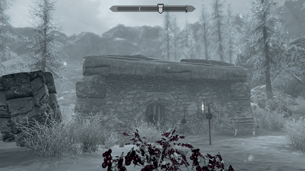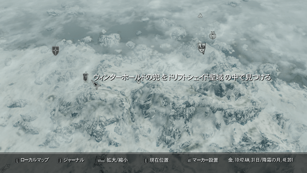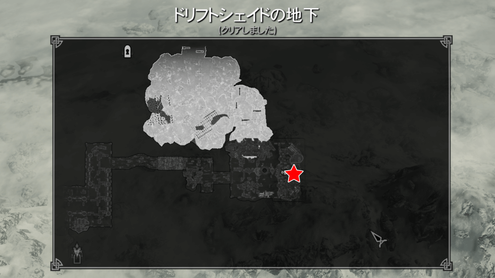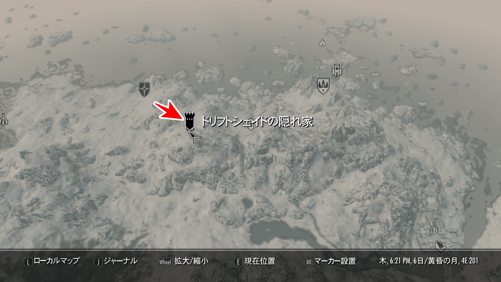 マップ 外観 クエスト開始後、ドリフトシェイドの隠れ家へ向かおう。場所は、ウィンターホールドから西へ進んだ山岳地帯にある。