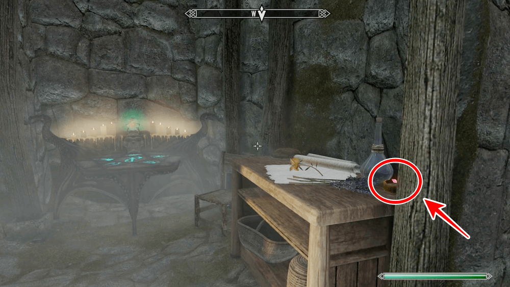 砦中央付近にあるアルケイン付呪器の部屋では、珍しい石を入手可能だ。珍しい石は、盗賊ギルドのサブクエストに必要なアイテムなので、忘れずに回収しておこう。