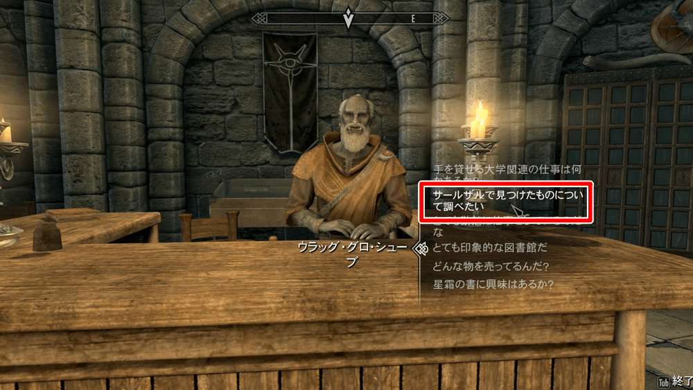 クエスト開始後、サールザルで見つけたオーブの情報を手に入れるために、ウラッグと話そう。ウラッグの居場所は、元素の間2階のアルケイナエウムという書庫だ。ウラッグの話を聞くと、直接力にはなれないが、盗まれた本に手がかりがあると教えてくれる。
