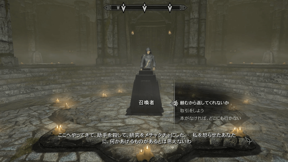 選択肢 結果 頼むから返してくれ 戦闘突入 取引をしよう オーソーンと交換で戦闘回避 本がなければ~ 説得成功で戦闘回避 儀式の間に着いたら、召喚者と対峙して本を入手しよう。会話の中で選んだ選択肢によって、召喚者と戦闘になるか、戦闘を回避するかが決まる。召喚者は特に強敵というわけではなく、倒せば隠し通路へ繋がる鍵を入手できるので、戦って倒すのがおすすめだ。