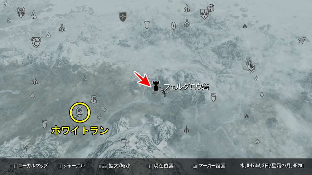 マップ 外観 本を取り返すために、フェルグロウ砦へ向かおう。フェルグロウ砦は、ホワイトラン北東の丘上にあるダンジョンだ。ダンジョン内には魔術師系の敵が出現するので、魔法耐性が上昇するアイテムや付呪防具を用意して向かうと良い。