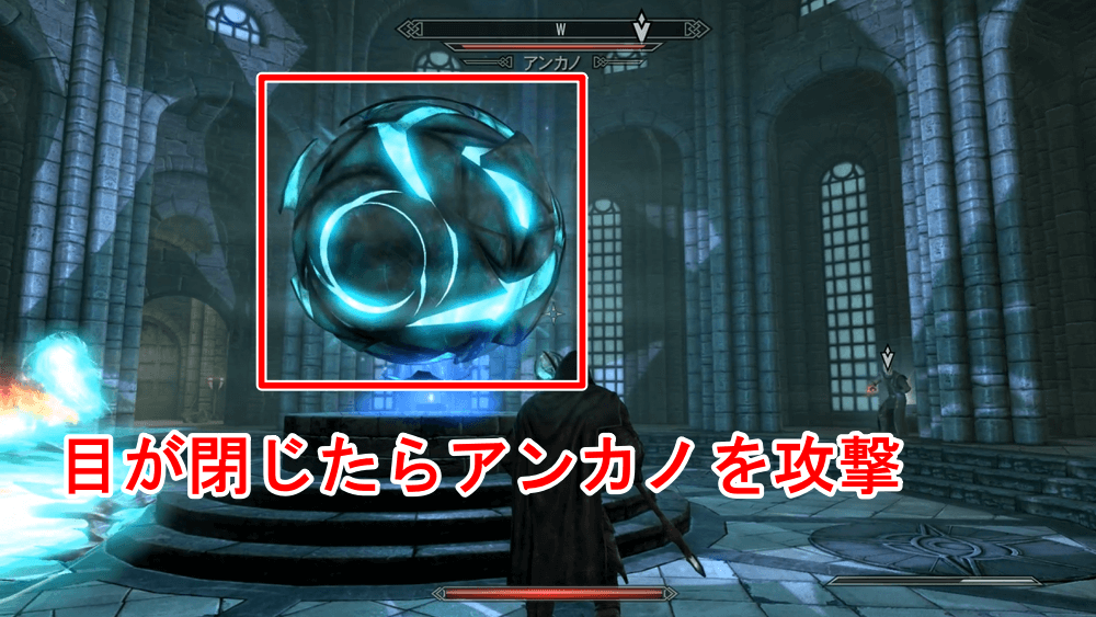 大学に入ったら元素の間へ進み、アンカノを倒そう。アンカノはマグナスの目の効果で無敵状態となっているため、まずはマグナスの杖で目を攻撃して、効果を遮断する必要がある。攻撃を続けると目が閉じるので、そのタイミングでアンカノにダメージを与えよう。