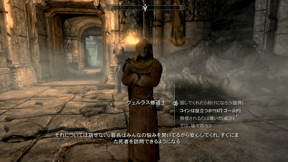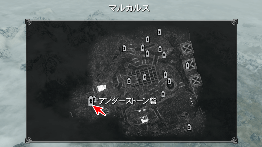 マップ 外観 「死者の間についてヴェルラスと話す」受注後、アンダーストーン砦でヴェルラスと話そう。死者の間で異変が起きているというので、説得・賄賂・威圧のいずれかの方法で、死者の間の鍵を入手する。